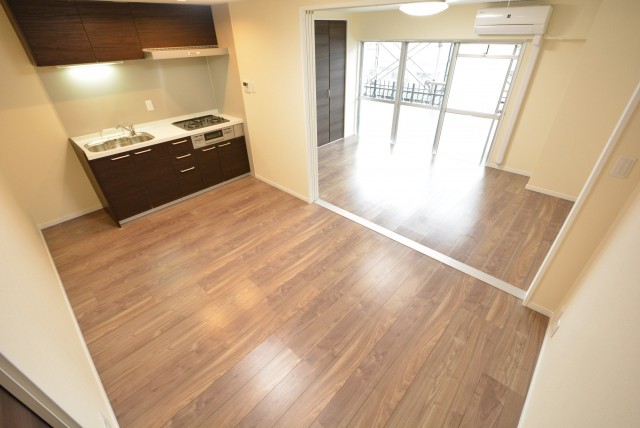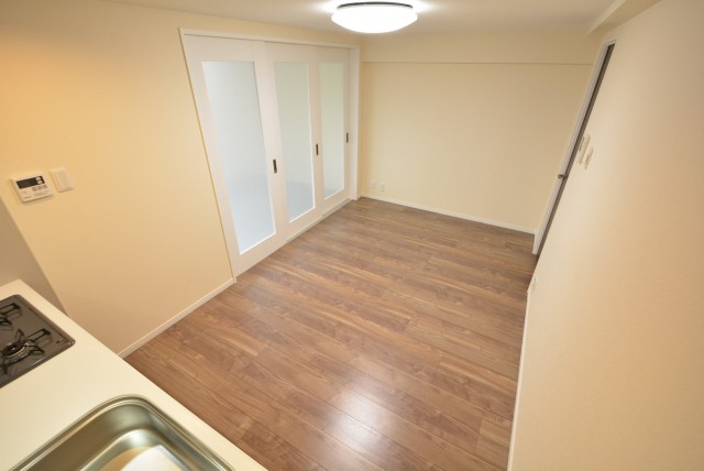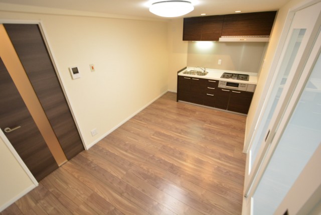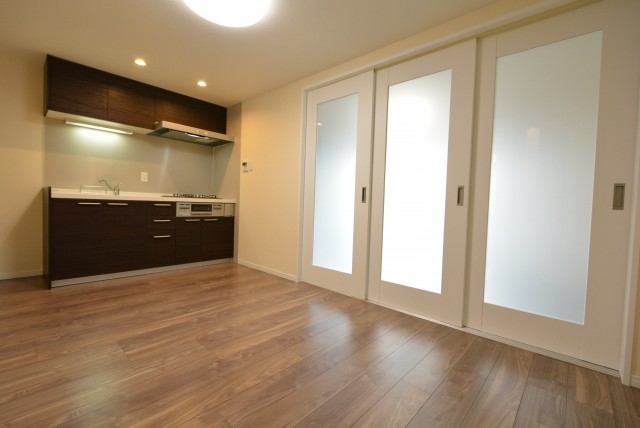 窓はありませんが、バルコニーに面した洋室からの光がガラス戸を通して入るようになっています。自然の木目を生かしたフローリングを使ったナチュラルな雰囲気のお部屋です。