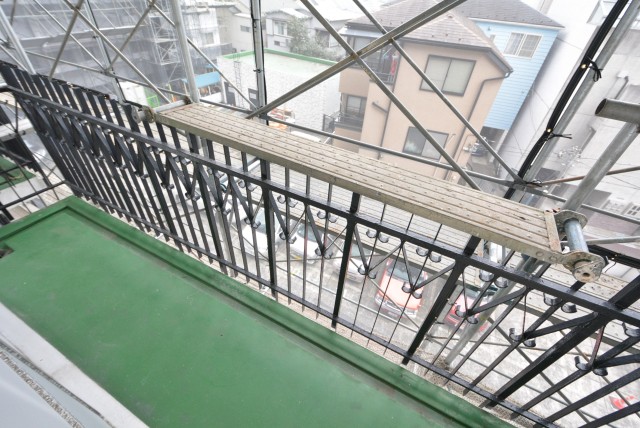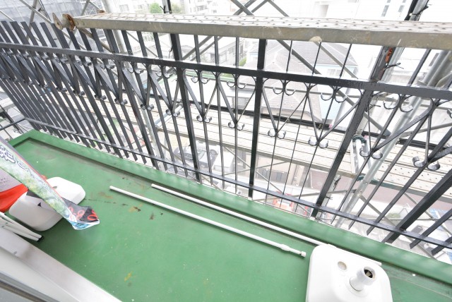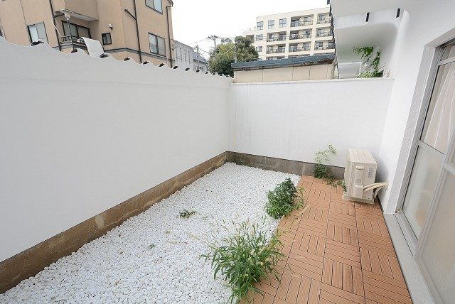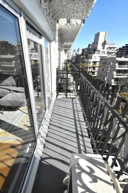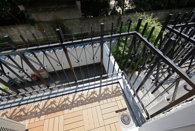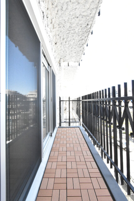 広さ3.9㎡、南東向き。手すりが足元まで柵になっているので開放的で数字以上に広々と感じるバルコニーです。床に綺麗にデッキパネルが敷かれているのも嬉しいですね。