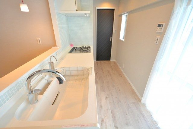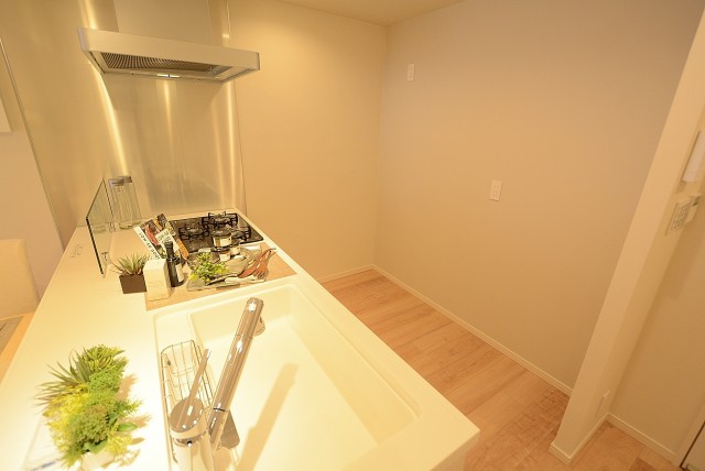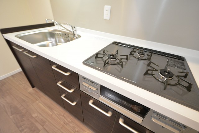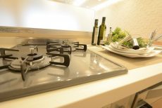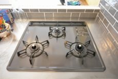 料理の段取りも3口コンロだとスピードがあがりますね。煮てる横では炒められ~と品数が増えそうです♪シンクとコンロ奥にあるスペースには、調味料なんて並べてはどうでしょう~お掃除もサーッと一直線に拭いてハイ!終わりと楽チンですね。