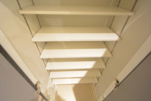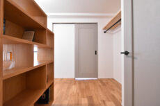 廊下を進んですぐ右側は大型収納。日用品のストックやシューズBOXに入りきらない靴など色々仕舞っておけそうです。可動棚なので物の大きさに合わせて調節できるのも便利ですね。
