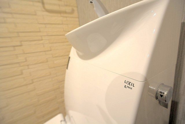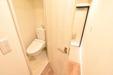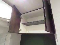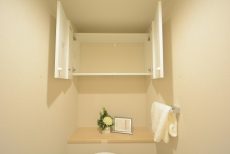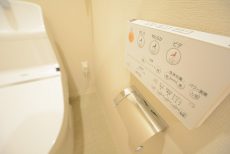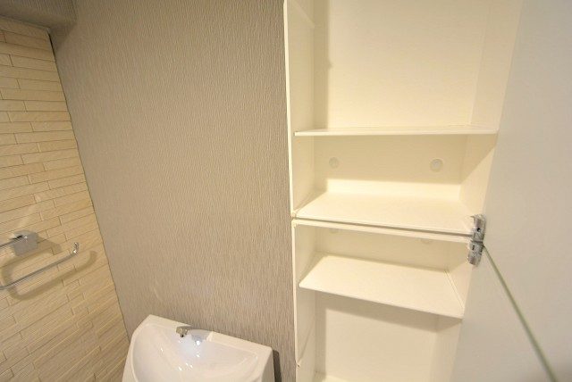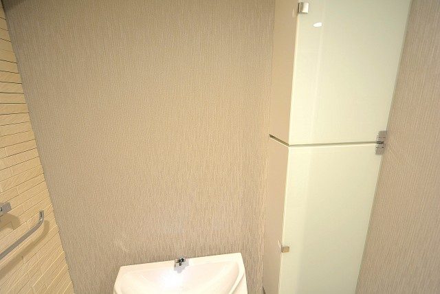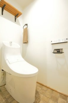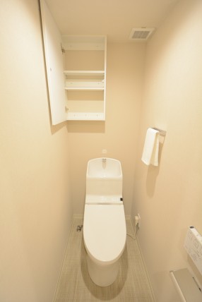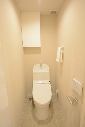 トイレはウォシュレット付き。手洗い場とペーパーのストックを入れて置くのに便利な吊戸棚が設置されています。