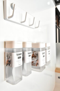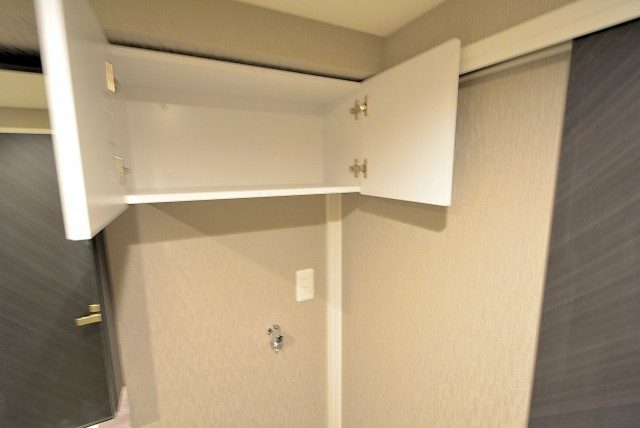 洗濯機置場上の棚は高さを調節することができます。背の高い液体洗剤ボトルもここに置いておけます。