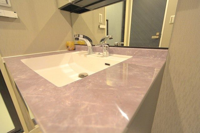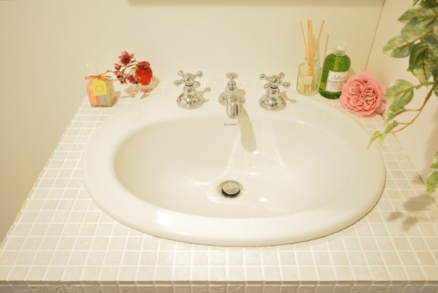 洗面台は不光沢。まわりはスペースがあるので写真の様に石鹸などを置くことができます♪