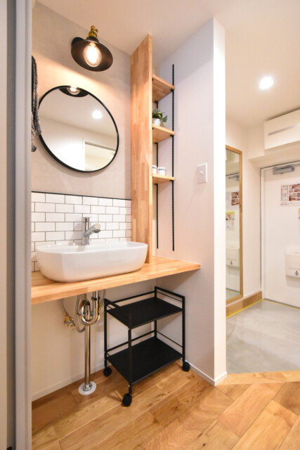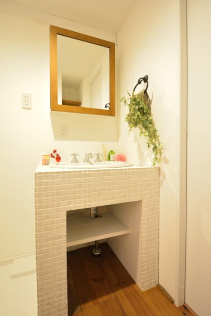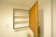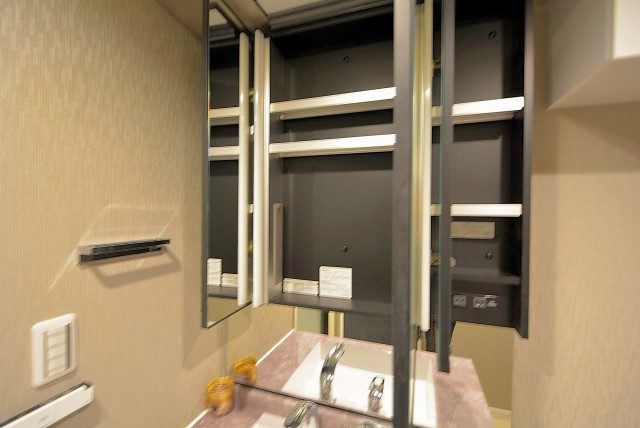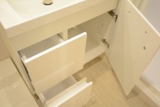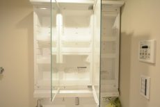 三面鏡はみやすくもちろん扉の裏には整理整頓しやすい収納、下の部分の収納にはストック洗剤など置くのに良さそうです。洗面台横のスペースは浴室に必要なタオル収納に小さなチェストなど置くと便利そうですね。
