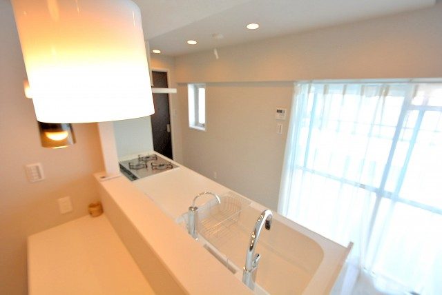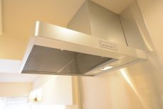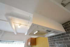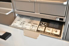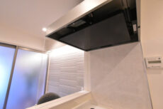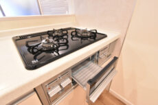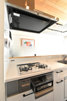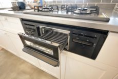 コンロは3口、グリル付き。しっかりお料理をしたい方にも満足していただけます。見えづらいかもしれませんが、コンロ前を塞ぐようにガラスの衝立が設置され油跳ねなどを気にする必要もありません。解放感と同時に使い勝手にも配慮されているんですね!換気扇は少し前から回しておくと効果的だそうですよ。