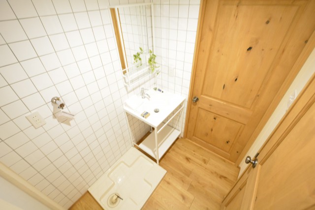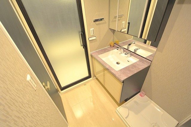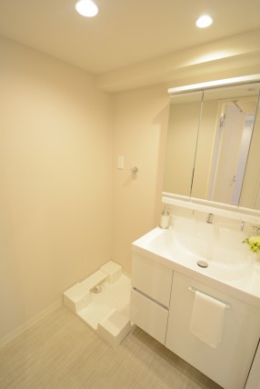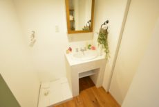 洗濯機置場と洗面化粧台はお隣同士。洗面化粧台は鏡の裏、引き出しと小物の収納スペースが豊富です。