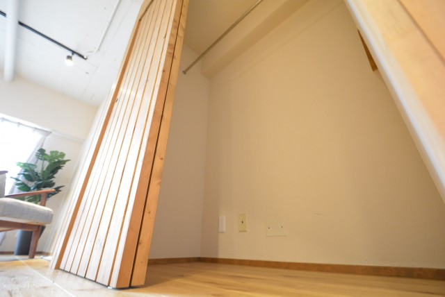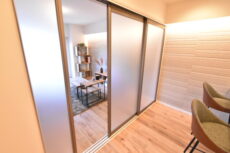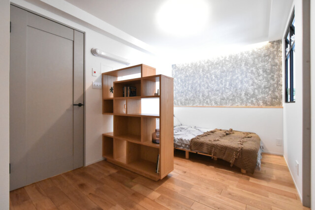 仕切りの扉は引き込み式なので全開にすればLDKとつなげて使うことも可能。ダイニングと揃いのアクセントウォールを使用していて一体感もありますよ。