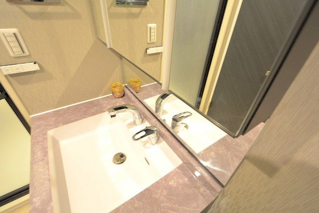 洗面台です。ゆとりたっぷりのウォッシュボウルは朝の洗顔もゴシゴシ洗えそうです・
