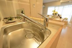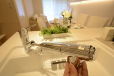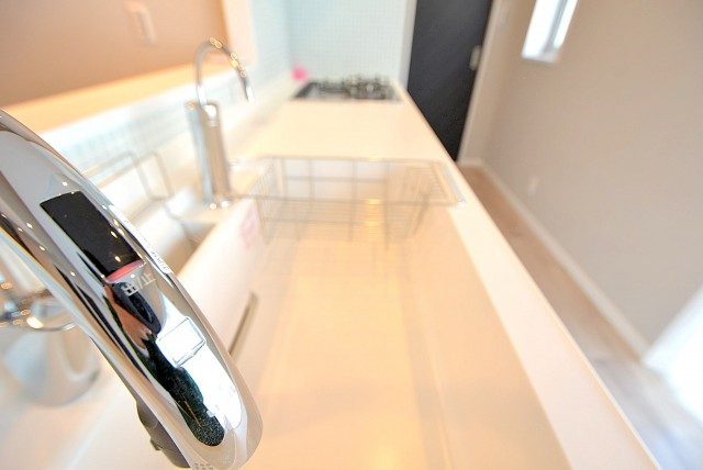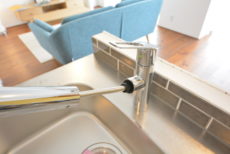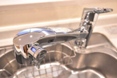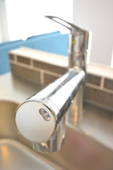 収納は扉タイプ。多少出し入れがしづらい面もありますので、収納グッズなどを上手く使って使いやすく収納したいところです。箸やスプーンなどのカトラリーは専用の引き出しがあるのでこちらへどうぞ。水栓は浄水機能付き。切り替えるだけで気軽に美味しいお水を使えます。