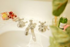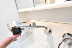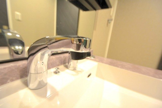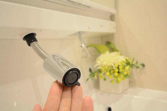 水栓はヘッドが引き出せるので洗面ボウルを流したりに便利です。三面鏡裏はキャビネットになってるので洗面周りの細々としたものもすっきりと片付きますよ。