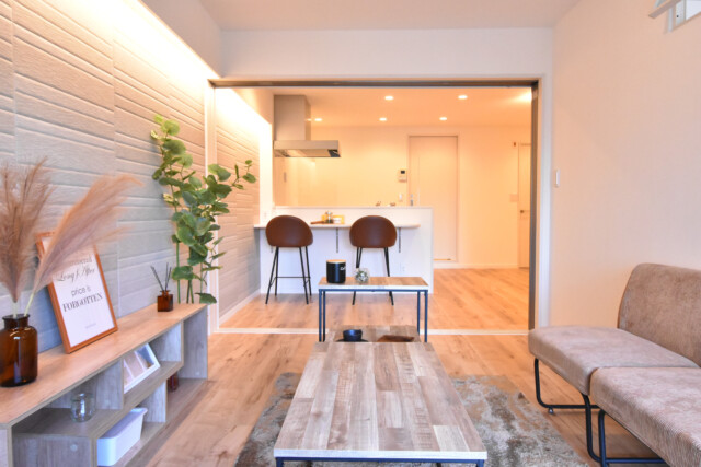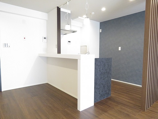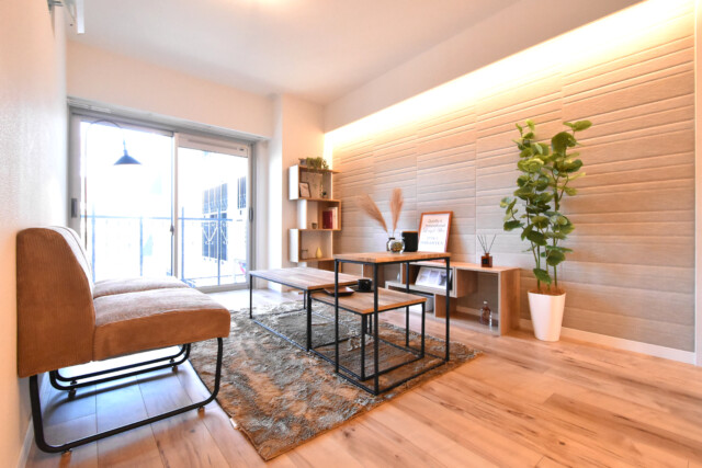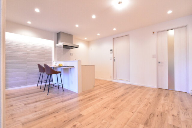 LDKは約11.3帖。壁面の一部には落ち着いた色合いのアクセントクロスが使われています。