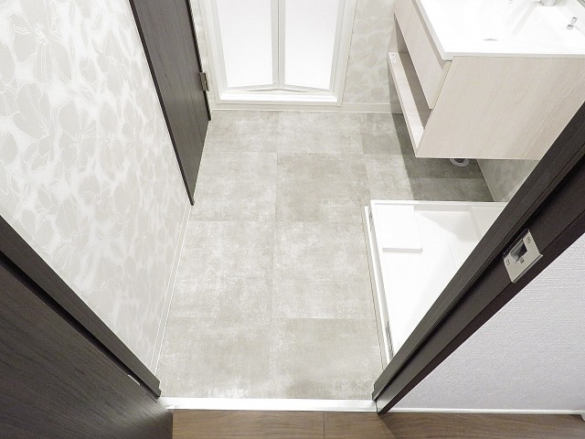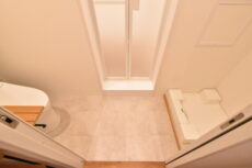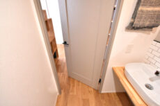 大型収納の向かい側は洗面室。洗面化粧台、洗濯機置場、トイレ、バスルームと水回りの設備が1か所にまとまっています。お掃除もまとめてこなしやすそうです。