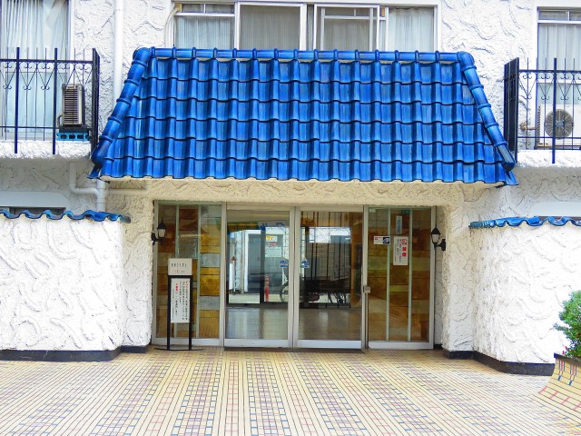白い外観に青い屋根の秀和シリーズのマンションです。