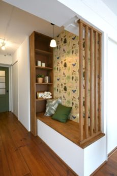 中に入ると白を基調にした明るい玄関が迎えてくれます。シューズボックスは収納力のあるトールタイプ。高さ調整が出来るのでブーツやヒールなどの高さのある靴でもきれいに並べて収納可能です。扉がないので見た目大事ですよね。シューズボックス下に付けたフットライトが足元を優しく照らしてくれています。