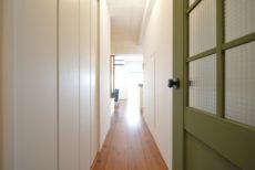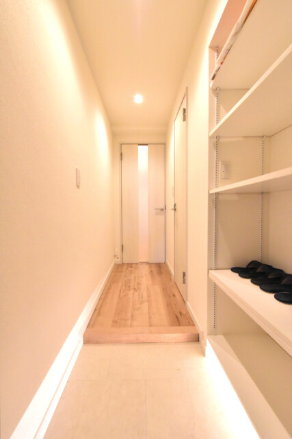 廊下の向こう側から明るい光がみえます。右側には真っ白なカウンターの玄関収納。