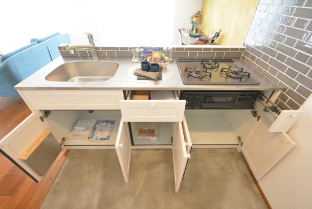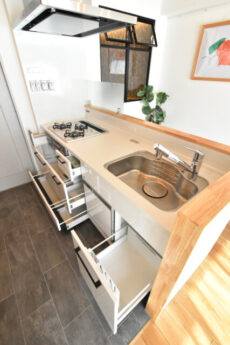 キッチンです。上下に収納もしっかりあります。調理スペースの下には引き出しが4段!こちらにはお箸や箸おき、スプーンやフォークなどのバラバラになりがちなものを整理整頓できそうです。