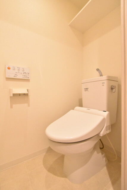 トイレはTOTO製の洗浄機能一体型。トイレットペーパーや掃除道具を置くのに便利な棚も付けられています。