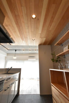 壁に向かって黙々と料理をするのもいいですが、一日にあったことなど話しながら夕飯の支度をするのもいいものです。腰壁が付けられ向こう側からはキッチン内が見えづらいのも有難いですね。