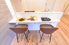 キッチンは開放感のあるオープンキッチン。テーブルとしても使えるカウンターが設置されているので、ダイニングテーブルを用意する必要はなさそうです。イスを2つ並べるとちょうどよい感じでしょうか。キッチンと食事をする場所が近いと後片付けも楽ですね。