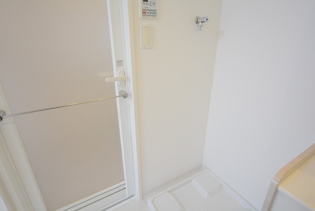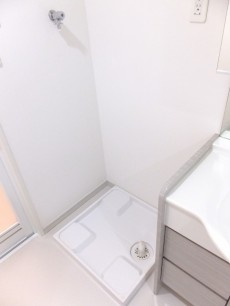 洗濯機置場は洗面台の隣にあります。ここには棚が付いていないので、先程の棚をうまく活用してくださいね~(^v^)