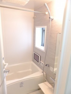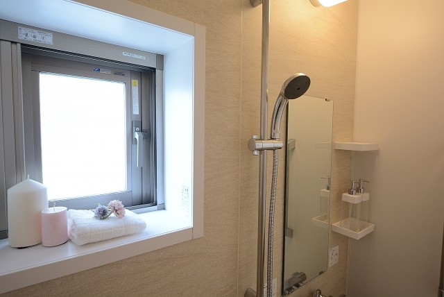 バスルームには採光&換気用の小窓が付いています。窓から光が入ってくるだけで、明るさだけでなく広さも違って見えますね(#^.^#)