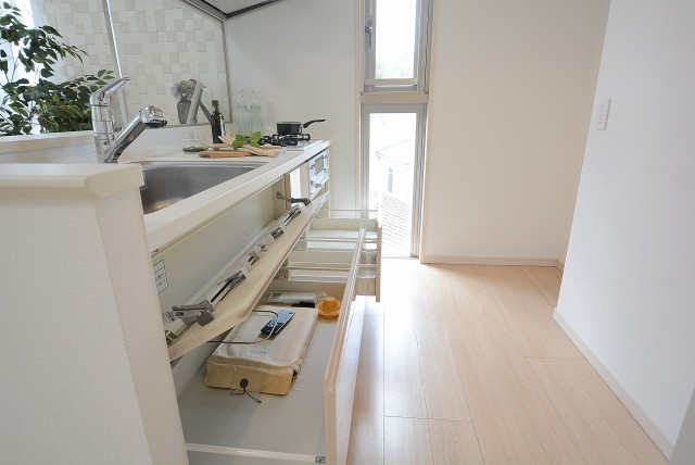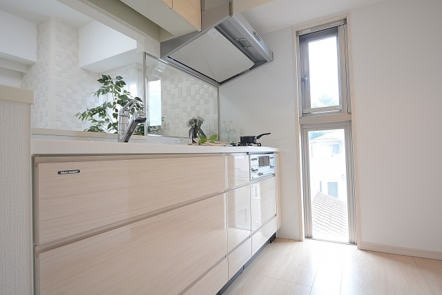 キッチンは2.7帖。背の高い窓が付いているので、もっと広く感じます。
