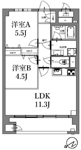 廊下左手にあるサニタリールームです。左に浴室、正面に洗濯機置き場・洗面化粧台、右にトイレとなっています。ゆとりある空間です。