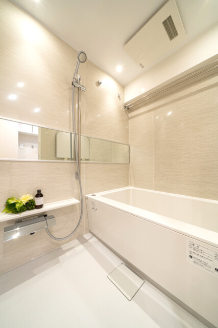 浴室は柔らかい色合いのパネルを使った優しい雰囲気。リラックスしてバスタイムを過ごせそうです。ユニットバスは追い焚き機能付きなのでお風呂の準備もボタンひとつ!いつでも温かいお風呂に入れますよ。雨の多い季節に嬉しい浴室換気乾燥機付き。