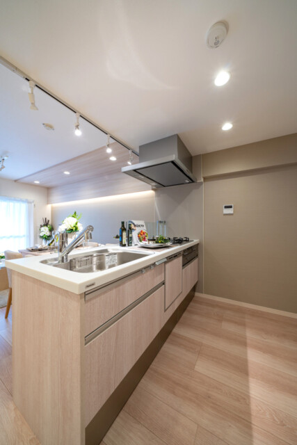 キッチンはカウンタータイプ。開放的で、お料理中でもリビングダイニングとコミュニケーションをとりやすいのが特徴です。調理台は建具と合わせた木目パネルでお部屋との統一感もバッチリ。食器洗浄乾燥機や浄水器一体型水栓などの便利機能も完備しています!