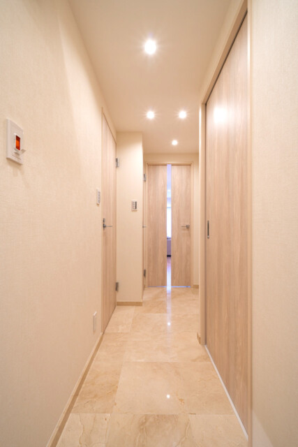 玄関から廊下にかけては大理石貼り!石材は冷たい印象なりがちですが、ナチュラルカラーの建具に合わせた温かみのある色合いで柔らかい雰囲気の空間になっています。シューズボックスは収納力のあるトールタイプなので、ややコンパクトな玄関に靴が溢れる心配もありませんよ。