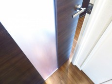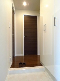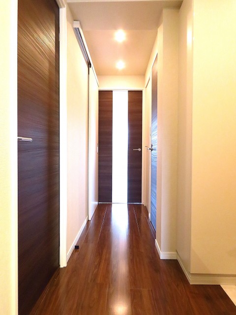 玄関正面には2部屋ある洋室の扉があり、廊下は右方向へ続いています。