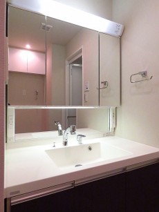 洗面化粧台は鏡の裏、引き出しと小物の収納スペースが豊富。