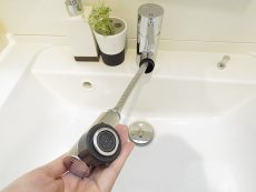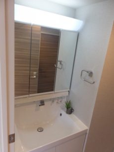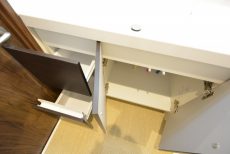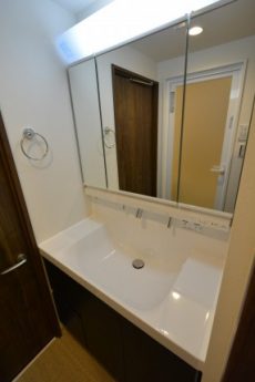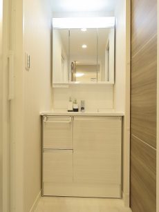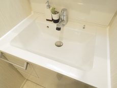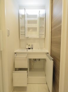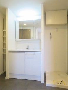 洗面化粧台、吊戸棚などの収納は白で統一され清潔感たっぷり。収納スペースが豊富にあるのでゴチャゴチャ散らかりがちな洗面まわりもスッキリ片付けられそうです。