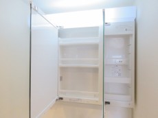 鏡の裏には三段の収納スペースが用意されています♪コンセントもありますよ!