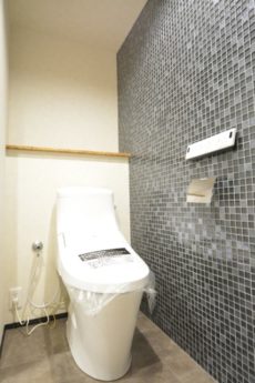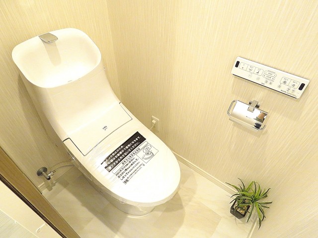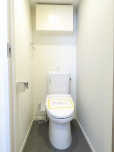 トイレはウォシュレット付き。こちらにも備えつけの収納がついています。
