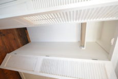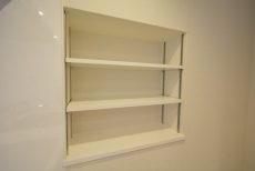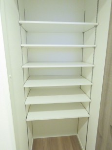 一番手前は収納棚。奥行きがあって棚の手前に尺のある物も入るようになっています。天井まで詰められるので結構入りますよ。