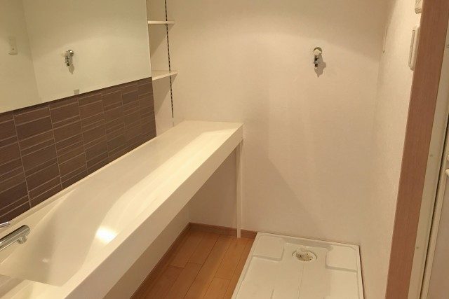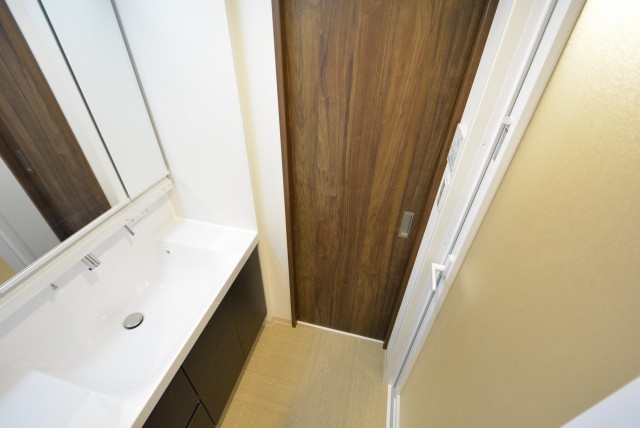 廊下を進んですぐ左側の扉は洗面室。縦長の脱衣スペースの左右に洗濯機置場、洗面化粧台、トイレ、バスルームが並んでいます。