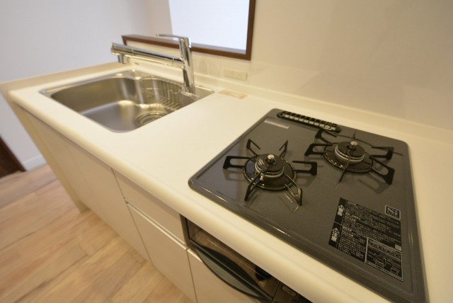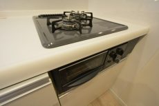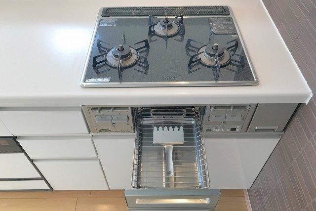 調理台下の収納や2口コンロ、魚焼きグリルがあります。