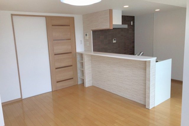 キッチンスペース。キッチンは壁側に取り付け、反対側にはカウンターが設置されています。