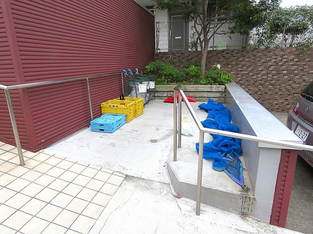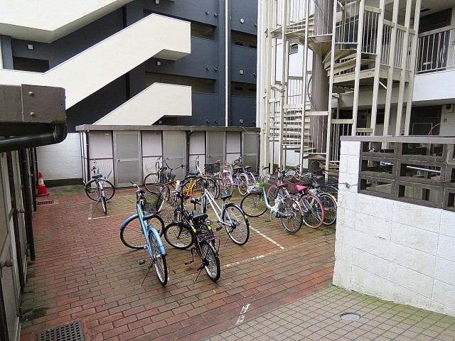 このままエントランスをまっすぐ進んだ奥に駐輪場がありました。(シール代で100円かかります。)駐車場、バイク置場はありません。