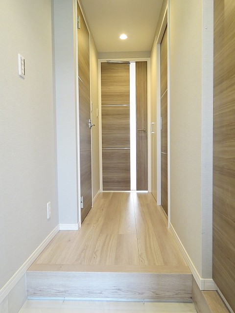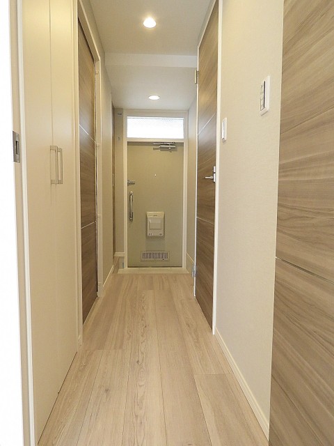 玄関をあがると廊下。右方向へのびており、突き当たってさらに奥へのびています。ちょうどL字型みたいな感じでしょうか。さっそく水廻りの設備から順番にご紹介いたします。