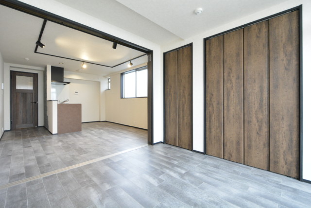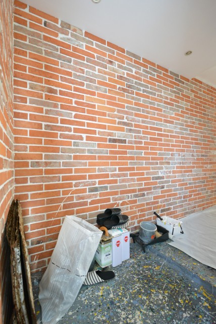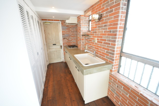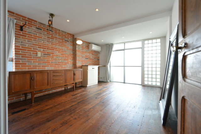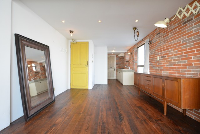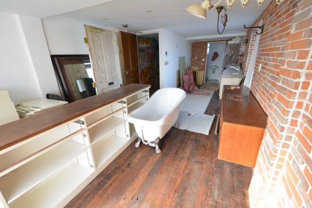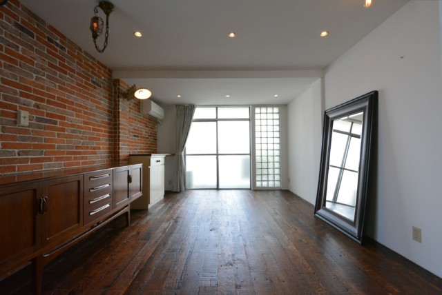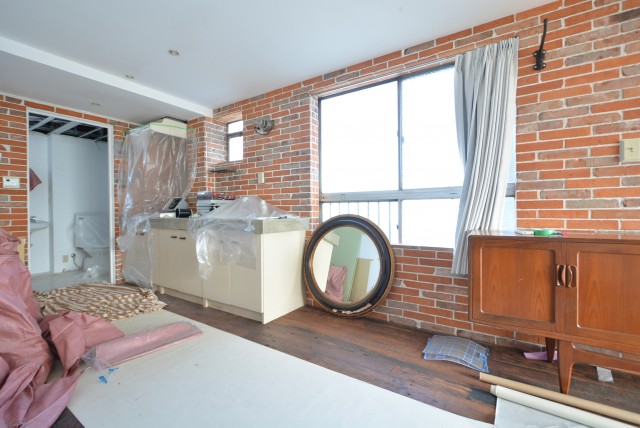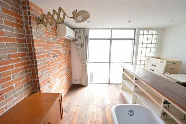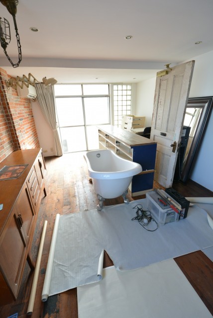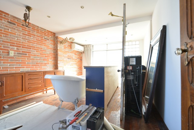 ブルックリンスタイルでしょうか。レンガの壁にヴィンテージ感のある建具や家具、小物。完成した状態で見てみたかったですね。場違いな浴槽が置いてありますが、どうやら浴室のタイルの張替え工事の為に外に出したようです。15帖を越えていますので、真ん中に出ている物があるべき場所に戻ればかなり広く感じると思いますよ。