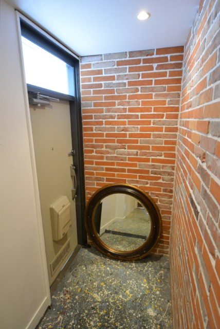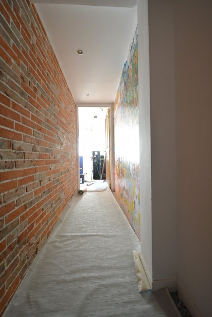 廊下の左の壁はレンガ。右側は…