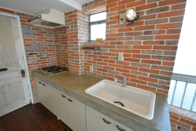 ワンルームとしてはかなり大きい調理台。個性的で好きな方にはたまらないですね。レンガ壁の中にある小さな窓もいい感じで、海外の古い映画で見た事がある様な雰囲気のキッチンです。