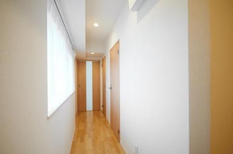 窓のある明るい廊下。目黒通りの車の走行音に配慮して窓は全て二重サッシになっています。(車の走行音は気になりません。)廊下側にある水回りの設備から順番にご紹介いたします。