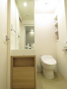 洗面化粧台とトイレはお隣同士。トイレはタンクレスで見た目もスッキリ。