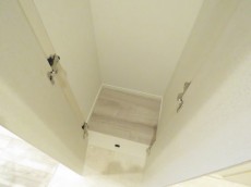 洗面室のお隣は物入れ。上にポールがついているのでお洋服もかけられます。