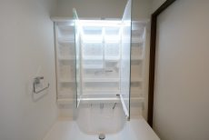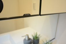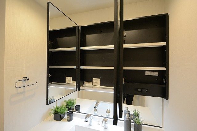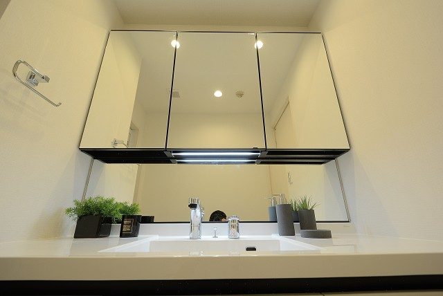 大きな3面鏡の付いた洗面化粧台が付いています。