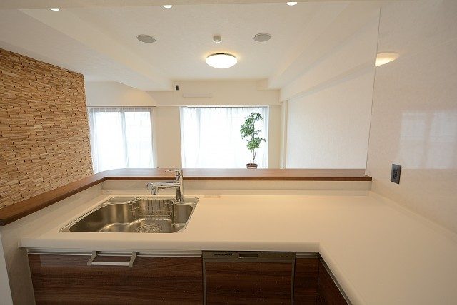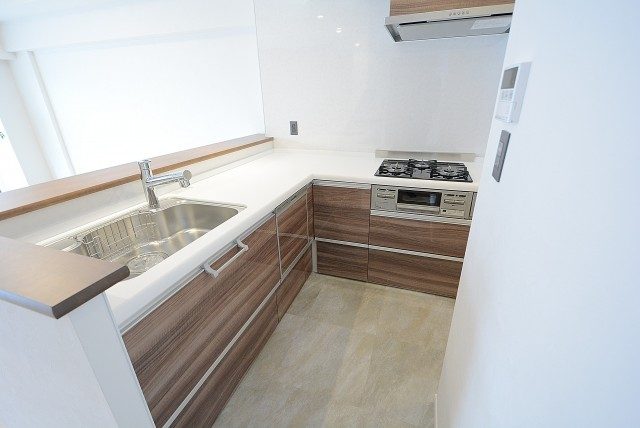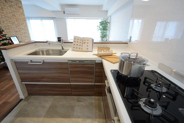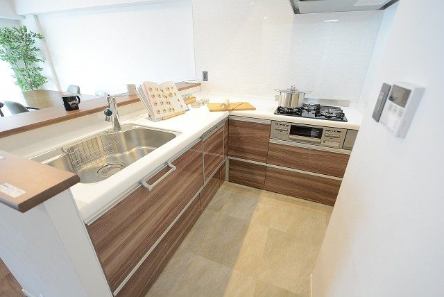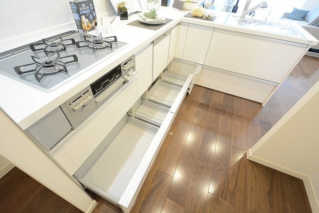 L字のカウンターキッチンなので、料理の作業スペースが広くとれ、同時にたくさんの料理を作ることが出来ます。シンクとコンロも90°だけ体を動かすだけで届くので、横に長い距離を移動する必要もありません。