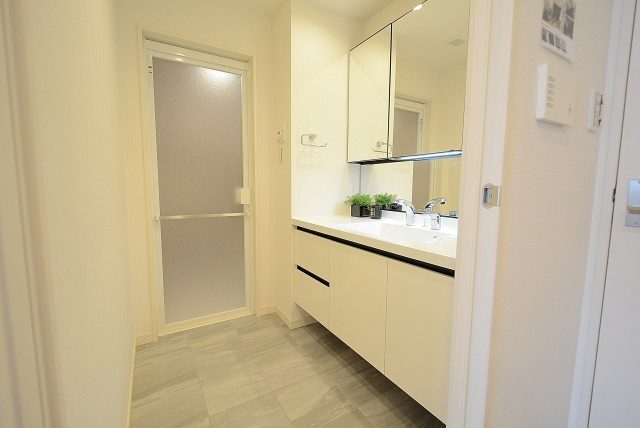 続いて洗面室です。洗面化粧台とバスルームが入っています。